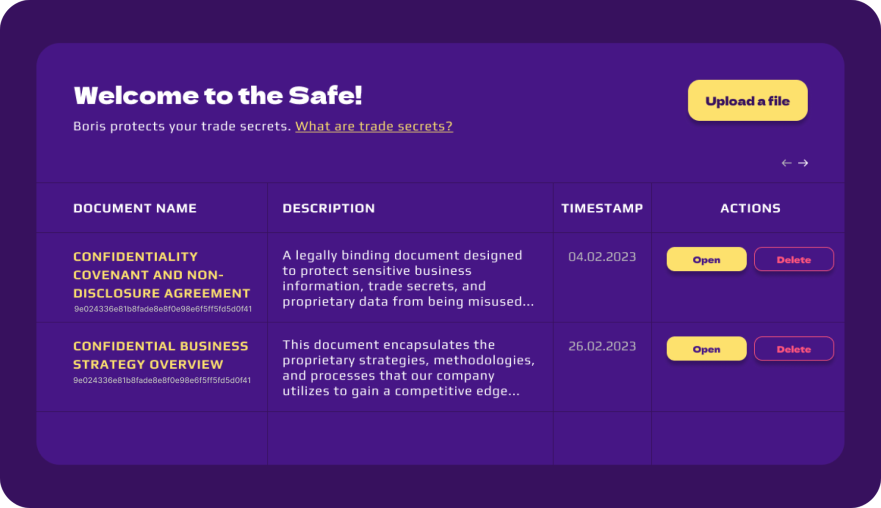 Trade secrets are the secret ingredients to your business's success.Be it a unique marketing concept, your state of the art algorithm, or that revolutionary deeptech innovation, Boris ensures that they remain secure while shareable.